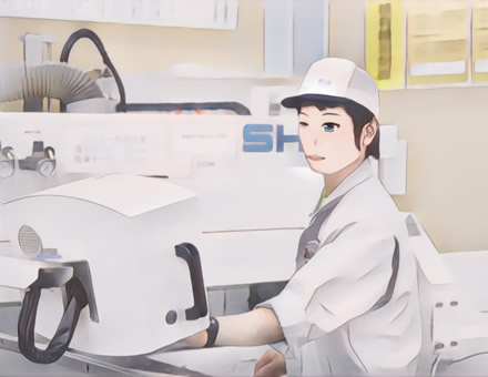 私は現在、樹脂製品の樹脂加工の作業を行っております。樹脂加工とは具体的に言うと樹脂の溶接、接着、切断、曲げ作業です。作業の流れは、樹脂材料を規格通りの寸法に切断→箱型等などさまざまな形になるよう切断した材料を接着→溶接、というのが一連の流れになります。曲げ作業とは、材料を丸型やU字型にする作業です。